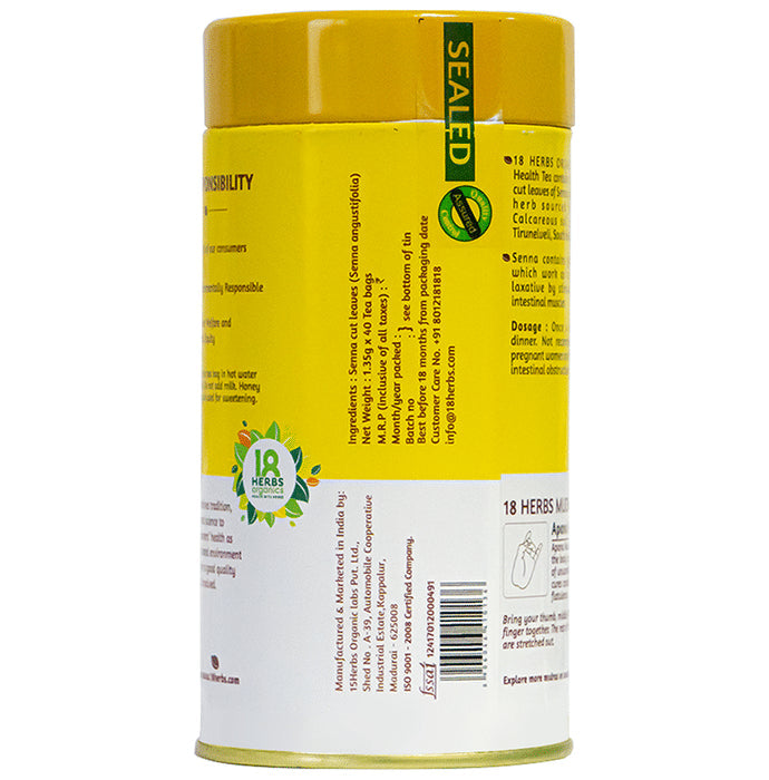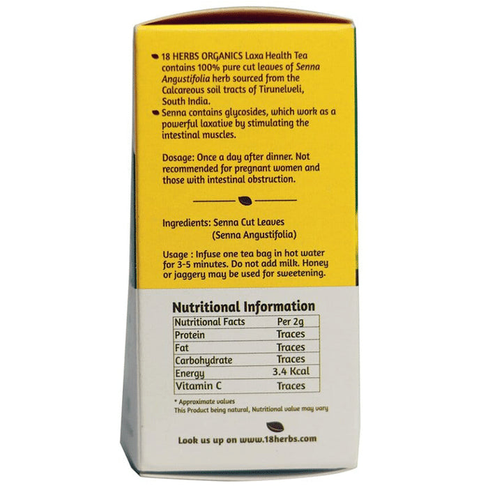 18 Herbs Organics Laxa Health Tea Bags contains 100% pure cut leaves of organically grown Senna herb (Cassia Angustifolia) sourced from the calcareous soil tracts of Tirunelveli, South India. Senna contains glycosides, which work as a powerful laxative by stimulating the intestinal muscles. In the process, it also helps detoxify the system and lose weight.