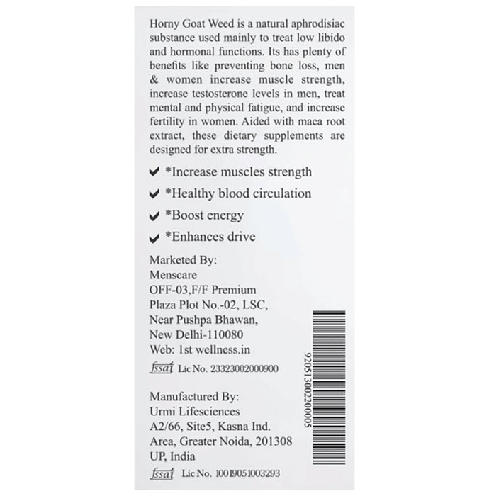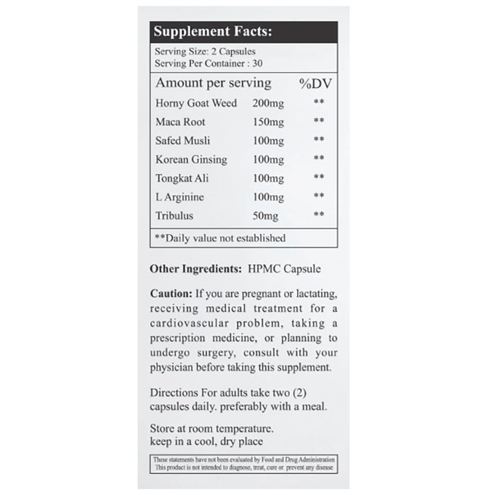 Composition : Horny Goat Weed|Maca Root|Safed Musli|Korean Ginseng|Tongkat Ali|L Arginine|Tribulus