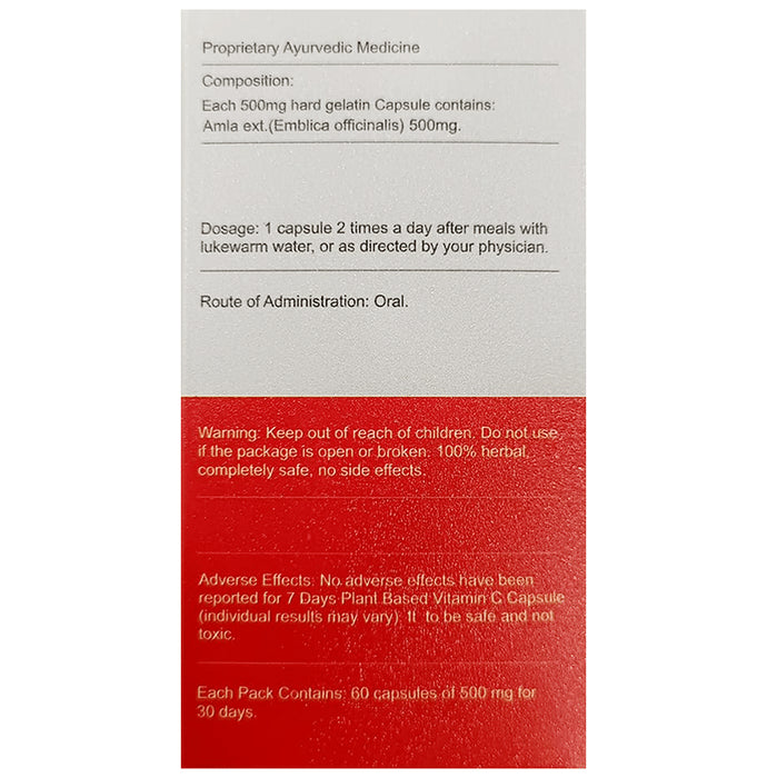 7Days Vitamin-C 500mg Capsule is suitable for consumption by adults and children. Vitamin C is a highly essential nutrient to boost immunity, prevent colds and coughs, and prevent ageing due to its antioxidant properties that fight free-radical damage to the body and boost the production of collagen that keeps skin, hair and bones healthy and young.