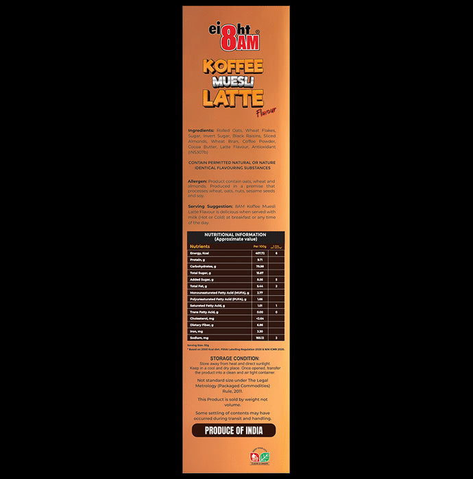 Eight AM Koffee Muesli Indulge in the rich and aromatic flavours of 8AM Koffee-Flavored Muesli, a delightful fusion of coffee indulgence and nutritious goodness. Carefully crafted with wheat flakes, rolled oats, wheat bran, and dried fruits, this muesli offers a satisfying breakfast experience that nourishes the body and tantalises the taste buds. Packed with protein-rich grains, and high fibre content, it provides a balanced and wholesome start to the day.