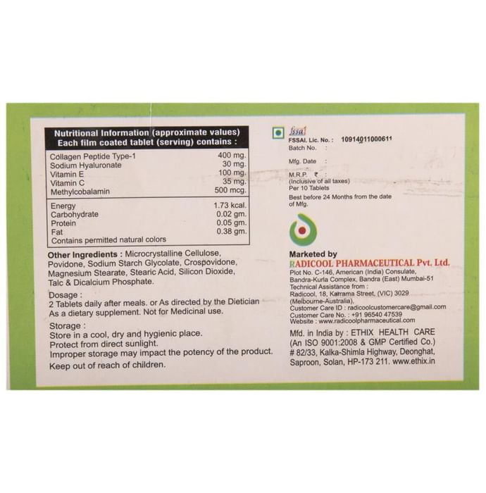 Composition : Collagen Peptide Type-1,Sodium Hyaluronate,Vitamin E,Vitamin C,Methylcobalamin,Contains permitted natural colours