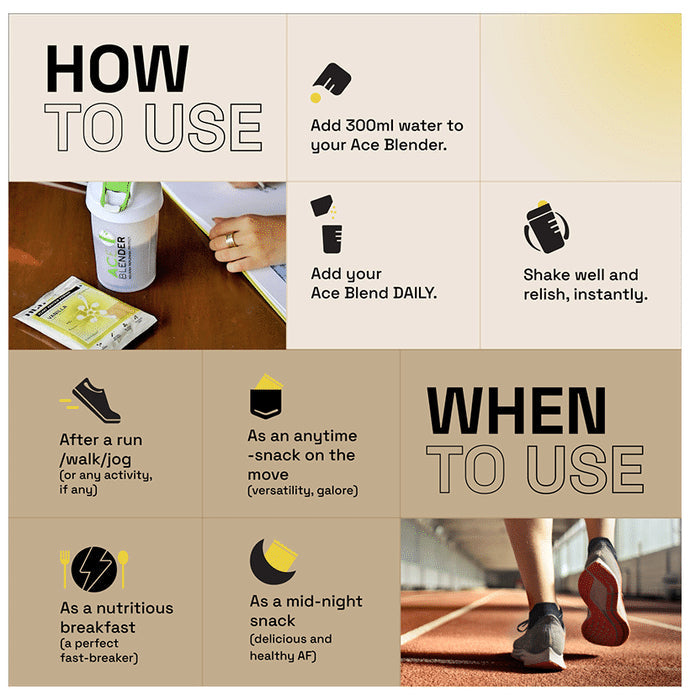 Ace Blend Daily Plant Protein Powder Full Spectrum Super Foods Assorted Sachet provides the body with 100% A-grade 20gm plant-based protein, blended with 4 multi-greens, 4 natural antioxidants, and 2.5B CFU multi-strain pre and probiotics. It is crafted for daily lifestyle use to promote overall health, fat management, high immunity, stress management, heart and brain health, gut microbiome diversity and balance, and skin, hair, and nail health.