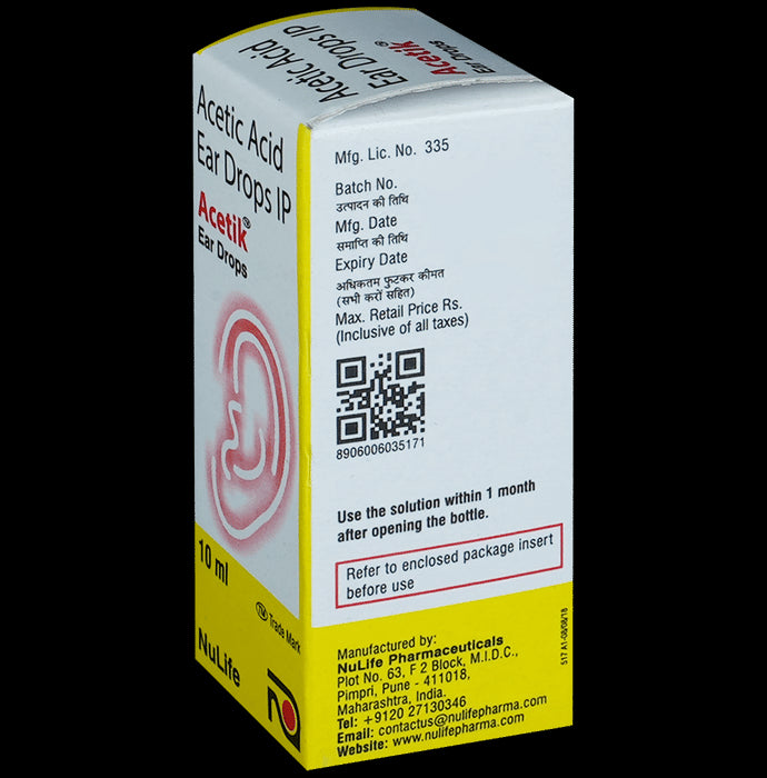 Acetik Ear Drop belongs to the class of medications called antibacterial and antifungal agents. It works by maintaining the pH thereby preventing the growth of bacteria and fungi. Thus, Acetik Ear Drop effectively treats ear infections.