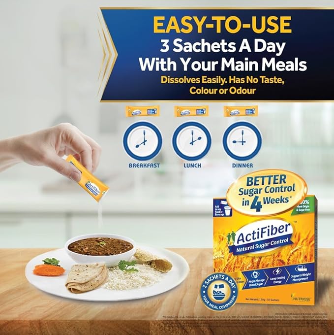 ActiFiber Natural Sugar Control is a clinically proven blood sugar supplement that helps regulate blood sugar levels in four weeks. It is natural and safe and recommended by nutritionists. Ingredients;Nutriose® (100% Wheat Dextrin)Indications:Help manage blood sugar and pre blood sugar and pre blood sugar better with regular use.Net quantity: 30 countProduct Form;Powder Key Benefits:Actifiber natural sugar control: It is 100% plant origin, soluble fibre nutrition that helps you to manage blood sugar and blood sugar naturallyHelps in better diabetes control: When ActiFiber is added to the meal, it helps digest food in a more controlled manner. This results in sugar being released slowly, and the sugar fluctuations are under better control. You also don’t feel tired and hungry constantly and have more energy to do moreNeeds no change in food habits: It can be added to any food or drink. It dissolves easily and does not have any colour, taste or odour. You won’t even know you have added it to your food or drink. Just add 1 Sachet to your 2 main meals and easily make ActiFiber a part of your daily dietRecommended by experts and approved worldwide: ActiFiber is trusted and recommended by experts (nutritionists) as a natural and safe diabetes care product. It is 100 % plant origin with no additives and preservatives. Its health benefits are approved worldwide by leading regulatory bodies – USFDA, European FSA, Canadian and Korean FDA. In India, it is approved by FSSAIA product of France: It contains 100% NUTRIOSE®, a product of Roquette Ferres, France.Directions for Use:Start with 2 sachets with a glass of water or mix with your mealIt is Easy-to-Consume and can be mixed with any food or beverage you loveIt dissolves easily with no taste, odour or colour thus fitting into your regular diet effortlesslySafety Information:Best before 24 months from the date of packagingIn case of pre-existing medical conditions, please consult your medical practitioner before consumptionNot recommended for infants and toddlersThis product should not be consumed by people who have an allergy to any of its ingredientsDo not use if the pack is tampered