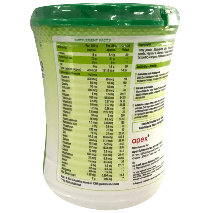 Actilife Pro Powder contains whey protein which is important for tissue growth and repair. The daily requirement of protein for adults is about 60g per day and its requirement increases during illness and malnourishment. Hence, it is important to take dietary protein supplements to maintain levels of protein in the body.