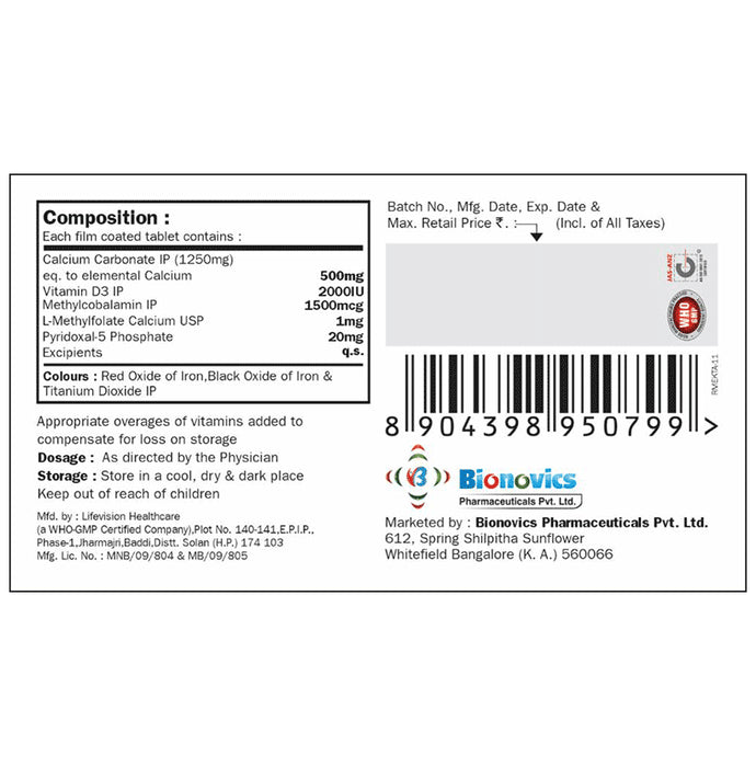 Composition : Calcium carbonate, Vitamin D3, Methylcobalamin, L-methyl folate calcium, Pyridoxal 5 phosphate