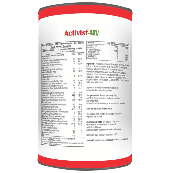 Activist-MV Tablet helps strengthen the body’s immune system while providing essential vitamins and minerals to hair, nails, and skin. It contains a combination of vitamins and minerals that contribute to healthy immune function and maintain good health. Biotin, vitamin E and vitamin C are added to support healthy hair and skin. Calcium, magnesium, vitamin K and vitamin D are added as a superior bone and joint blend. It supports healthy immune function.