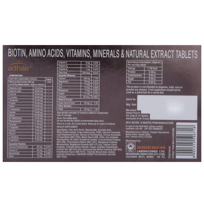 Adhair Tablet is a dietary supplement for managing concerns associated with premature greying and uncontrolled hair fall. It supplies hair with fortifying substances like biotin, grape seed extract, l-arginine and amino acids. It maintains the hair structure, strengthens the hair, and increases the resistance of the hair to mechanical and chemical damage. Adhair tablets are used as a dietary supplement that helps with healthy hair growth as well as managing hair loss. It is also useful in hair loss due to changes in the hair structure (stressed, thin, inelastic, brittle, lifeless, dull and colourless hair.