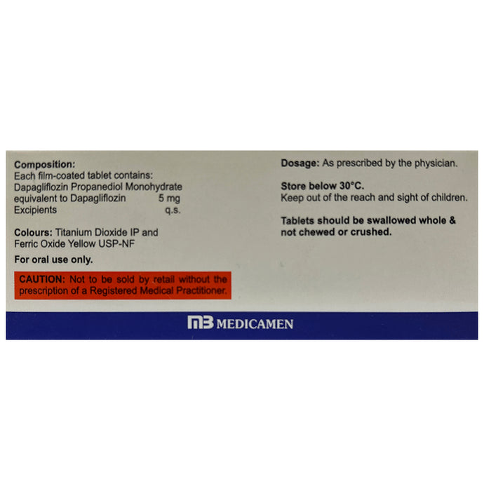 Affodapa 5 Tablet is used alone or in combination with other medicines to treat type 2 diabetes mellitus. It helps control the high blood sugar levels seen in diabetes. This reduces the chances of serious complications of diabetes and also helps prevent heart disease. Affodapa 5 Tablet can be taken with or without food at any time of day but you should try to take it at the same time every day. The dose will be decided by your doctor. Do not stop taking it without asking your doctor. If you do, your blood sugar levels may increase and put you at risk of serious complications like kidney damage and blindness. This medicine is only part of a treatment program that should include a healthy diet, regular exercise, and weight reduction as advised by your doctor.The most common side effects of Affodapa 5 Tablet include fungal infection of the vagina, nasopharyngitis (inflammation of the throat and nasal passages), and urinary tract infections. It may cause the body to lose too much water. Drink plenty of fluids to prevent dehydration. Maintaining good hygiene can help prevent the development of fungal infections in the genital area.Before taking this medicine, inform your doctor if you have any kidney or liver problems or a urinary tract infection or if you are on water pills (diuretics). Pregnant or breastfeeding women should also consult their doctor before taking it. Avoid excessive alcohol intake while taking it as this may increase the risk of developing some side effects. Monitor your blood sugar levels regularly while taking this medicine.