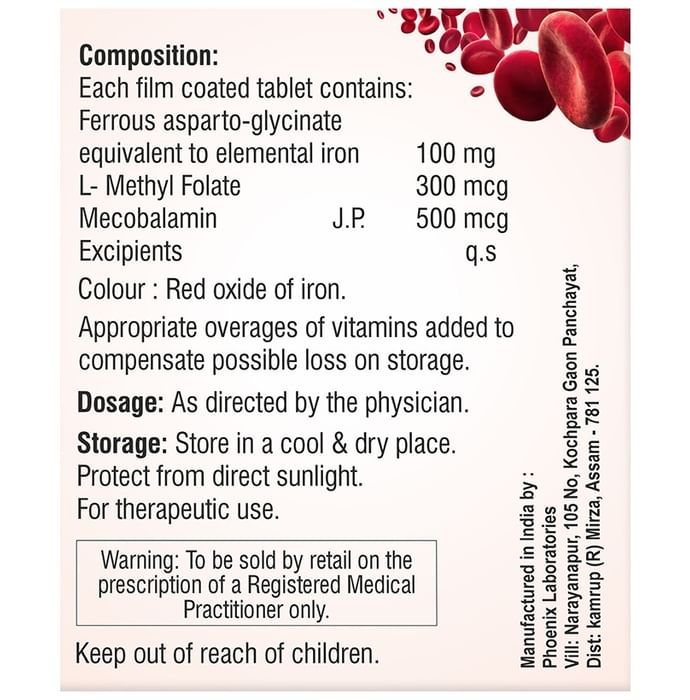 Composition : L-Methyl Folate (300mcg) + Methylcobalamin (500mcg) + Iron (100mg)