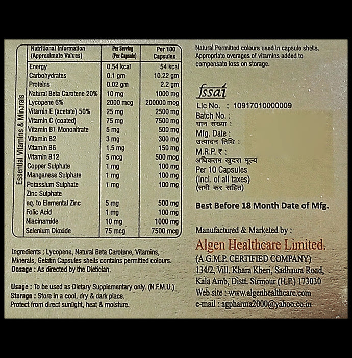 Composition : Lycopene, Natural beta carotene, Vitamin E, Vitamin C, Vitamin B1, Vitamin B6, Vitamin B12, Copper sulphate, Manganese sulphate, Potassium sulphate, zinc sulphate, Folic acid, Niacinamide, Selenium dioxide etc