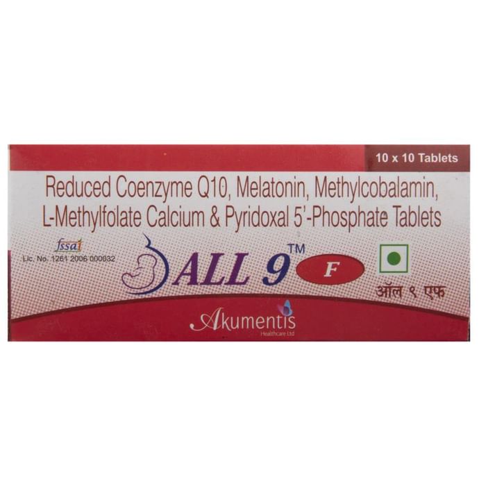 All 9 F Tablet is a nutritional supplement with coenzymes and vitamins that help in cell growth and maintenance. It is useful in performing normal body functions, make up the deficiencies in the body and protection of cells from wear and tear.