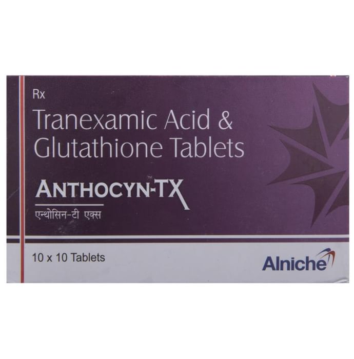 Anthocyn-TX Tablet is a combination of two medicines : Tranexamic Acid and Glutathione. Tranexamic Acid is an anti-fibrinolytic that reduces the production of melanin (a pigment that gives the skin its color), by altering the activity of some enzymes that aid in melanin synthesis. Glutathione is an antioxidant that protects cell and tissue damage, lightens skin tone and helps in detoxification of the skin.
