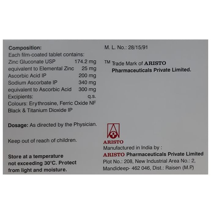 Aristo Immugard C Tablet is a health supplement with zinc and vitamin C. It contains ascorbic acid that has antioxidant properties. Zinc is found in the cells in the body and helps in cell division. It is also needed for the senses of smell and taste.