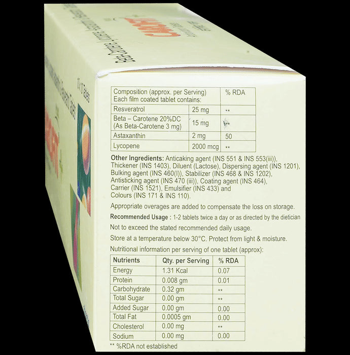 Composition : Beta-Carotene 20% DC (As Beta - Carotene 3 mg),Lycopene,Astaxanthin,Resveratrol,Other Ingredients: MCCP pH 102, Dried Starch, Lactose (DCL 21), Croscarmellose Sodium, Colloidal Silicon dioxide, Talc