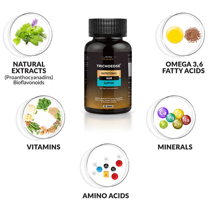 Derma Essentia Trichoedge Hair Support Tablet is a nutritional hair support supplement which is loaded with natural extracts. It helps to nourish the hair and scalp while preventing hair loss. It helps to rejuvenate the hair follicles and promotes new hair growth. It is effective in increasing hair fullness and helps to strengthen the hair. It promotes thick, strong and healthy hair.