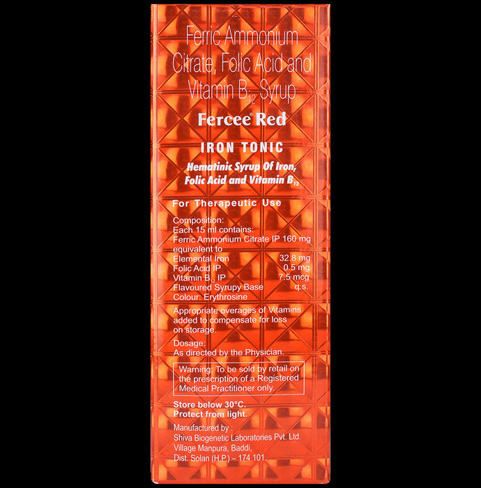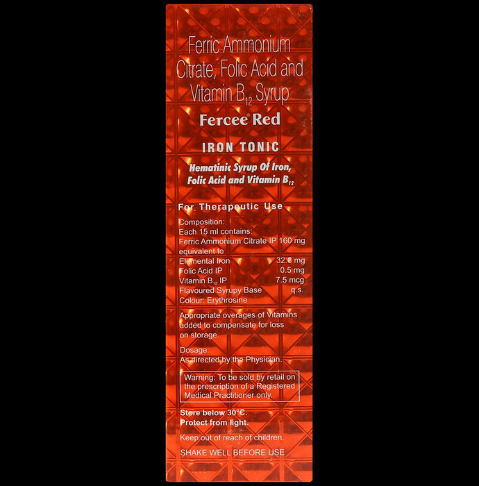 Fercee Red Syrup is a nutritional supplement primarily used for the treatment of iron deficiency anaemia and nutritional deficiencies. It contains ferrous ammonium citrate, which is a source of iron. Iron plays a crucial role in transporting oxygen throughout the body and maintaining red blood cells