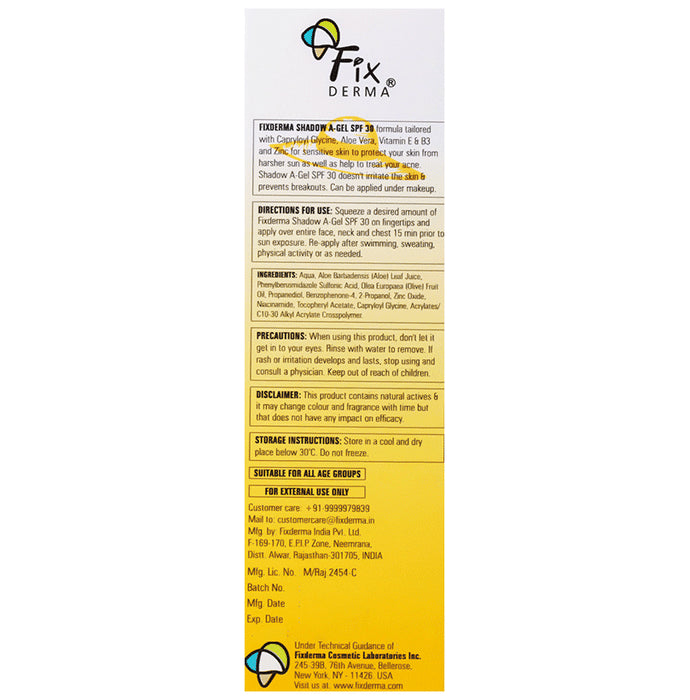Fixderma Shadow A-Gel SPF 30 is useful for shielding the skin from UV rays. It contains aloe vera leaf juice, which helps to soothe sunburns and lighten dark spots. It also has niacinamide, which aids in the reduction of fine lines and wrinkles.
