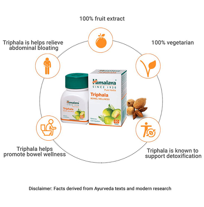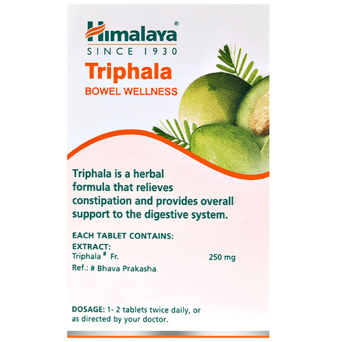 Himalaya Wellness Pure Herbs Triphala Bowel Wellness Tablet / For Constipation & Stomach Care is an herbal supplement that aims to support digestive health and relieve constipation. Triphala, which is a combination of three fruits - Amalaki (Emblica Officinalis), Haritaki (Terminalia Chebula), and Bibhitaki (Terminalia Bellirica), is known to provide a gentle pro-kinetic effect on the bowels. This herbal blend is believed to help regulate bowel movements and relieve long-standing constipation.