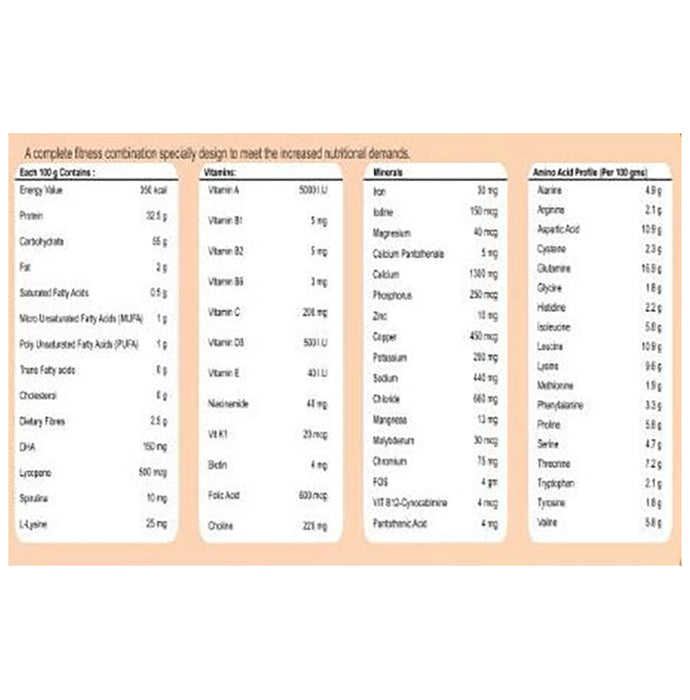 Composition : Protein 32.5 g per 100 g,Flavouring and aromatic agents,Vitamins and minerals