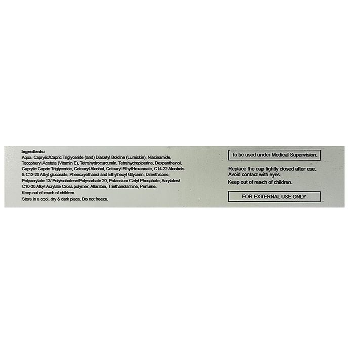 Composition : Aqua, Caprylic/Capric Triglyceride (and) Diacetyl Boldine (Lumiskin), Niacinamide, Tocopheryl Acetate (Vitamin E), Tetrahydrocurcumin, Tetrahydropiperine, Dexpanthenol, Caprylic Capric Triglyceride, Cetearyl Alcohol, Cetearyl Ethylhexanoate, C14-22 Alcohols, C12-20 Alkyl glucoside, Phenoxyethanol and Ethylhexylglycerin, Dimethicone, Polyacrylate 13/ Polyisobutene/Polysorbate 20, Potassium Cetyl Phosphate, Acrylates/ C10-30 Alkyl Acrylate Crosspolymer, Allantoin, Triethanolamine, Perfume