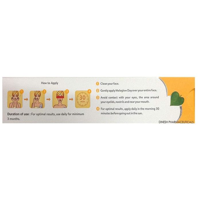 Melaglow Day Cream contains Avobenzone, Glabridin, Soya Isoflavonoids and Tetrahydro Curcuminoid as active ingredients. The SPF 35 + cream protects the skin from harmful Infrared and ultraviolet (UVA, UVB) radiations that cause premature aging, skin burns, pigmentation, and increased risk of skin cancer. It also acts as skin whitening and skin lightening agent.Key benefits/uses of Melaglow Day Cream:- Avobenzone: Protects skin from UVA rays that cause premature aging and skin cancer- Glabridin: Anti- inflammatory, antioxidant and skin whitening agent- Isoflavonoids: Strong anti- inflammatory properties- Curcuminoids: Possesses antioxidant and anti- inflammatory benefits that boost health and wellness- Suppresses melanogenesis- Reduces skin aging- Treats hyperpigmentation disordersDirection for use/Dosage:- Apply Melaglow Day Cream to the cleansed face and neck daily before sun exposure- Reapply after few hoursIndications:- Skin whitening and hyperpigmentationStorage instructions:- Store in a cool, dry, & dark place- Protect from direct sunlightSafety information:- Wash your face and apply only with clean hands- Read the label carefully before use - Do not exceed the recommended dose - Keep out of the reach and sight of children