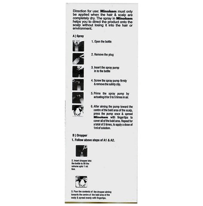 Minokem 5% Spray is a potassium channel opener. Its vasodilation action expands the blood vessels. Therefore, when it is applied to the scalp, it helps to increase blood flow. This increased blood flow provides more nutrition and oxygen to the hair follicles, which prevents hair cell death and also enhances new hair growth. This is how it works to treat your alopecia (hair loss).