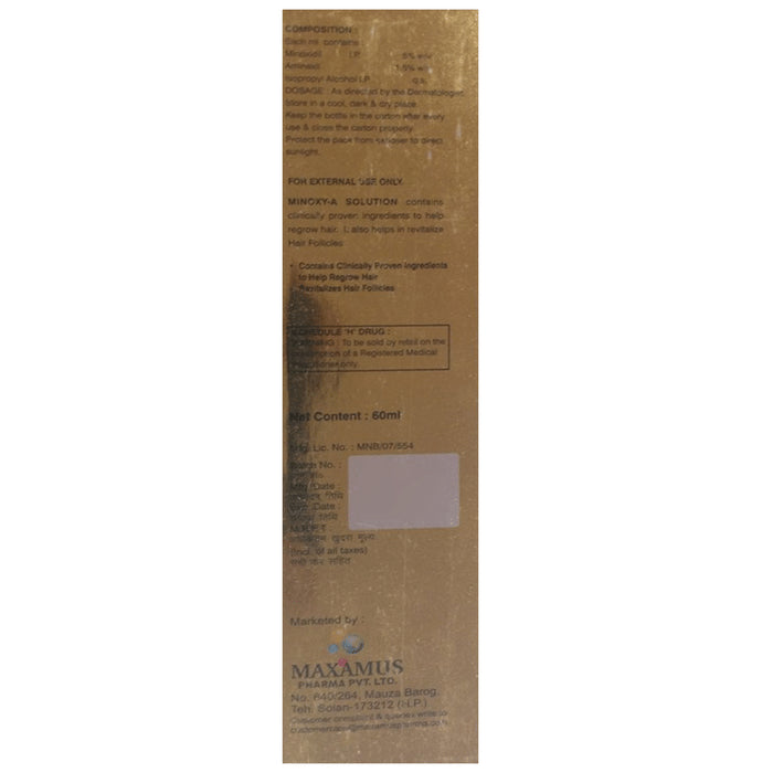 Minoxy-A Solution is a combination of two hair growth promoters: Minoxidil and Aminexil. Minoxidil is a vasodilator, meaning it widens the blood vessels and provides better blood flow to the hair follicles. This prevents hair loss and stimulates re-growth resulting in longer, thicker and increased numbers of hair. Aminexil suppresses an enzyme which causes buildup of a protein (collagen) around the hair follicles leading to hair loss.