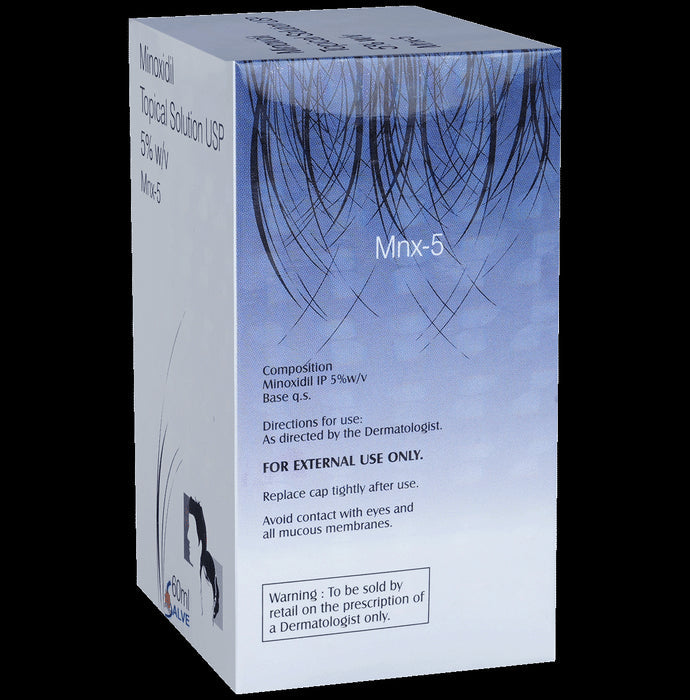 MNX 5 Solution is a potassium channel opener. Its vasodilation action expands the blood vessels. Therefore, when it is applied to the scalp, it helps to increase blood flow. This increased blood flow provides more nutrition and oxygen to the hair follicles, which prevents hair cell death and also enhances new hair growth. This is how it works to treat your alopecia (hair loss).