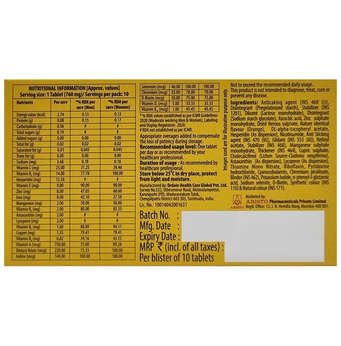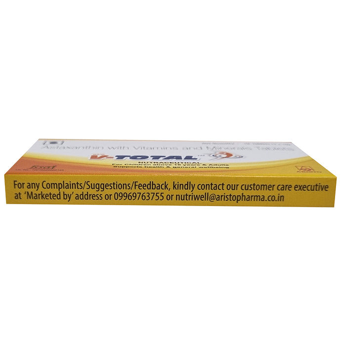 V-Total Nutraceutical Tablet offers a wide range of health benefits. Astaxanthin, a powerful antioxidant, supports skin health and immune function. Vitamin C and E further enhance the antioxidant effect, promoting cellular health and immune support. B vitamins (B2, B12) help in energy metabolism and nerve function, while zinc, iron, and manganese support various bodily functions, including immune support and energy production. Lycopene, copper, vitamin A, selenium, and chromium contribute to overall health, including eye health, skin health, and metabolism regulation. D-biotin and vitamin D3 play crucial roles in supporting healthy hair, skin, bones, and immune function. Together, these nutrients provide comprehensive health support, promoting overall well-being and vitality.