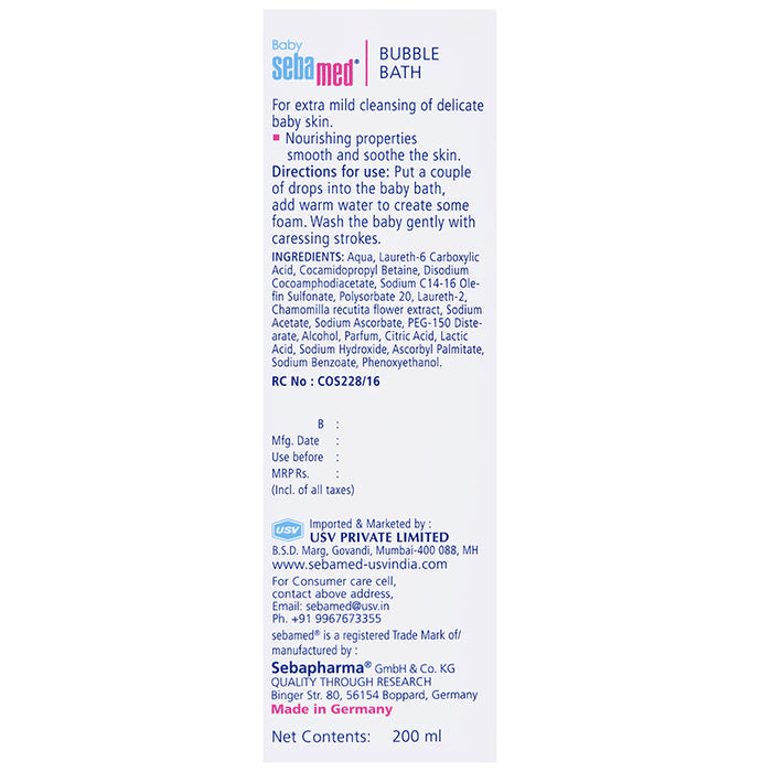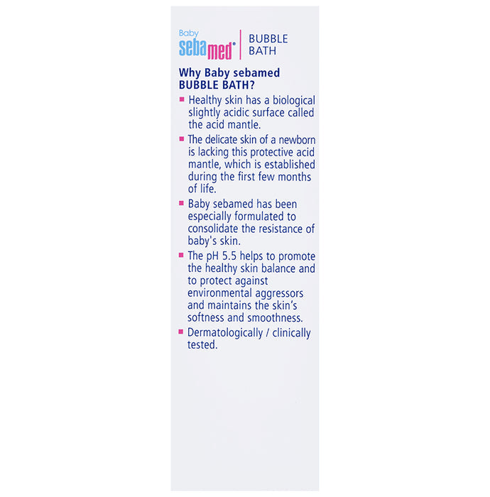 Sebamed Baby Bubble Bath has a pH of 5.5 and has extra mild sugar-based cleanser. It is a mild foaming bath additive with cleansing properties. It strengthens the resistance of baby skin with a physiological pH of 5.5. At pH 5.5, the skin barrier remains intact and lipid and moisture loss is minimal. It also restricts the growth of pathogenic bacteria. This baby bubble bath has chamomile, which soothes irritated skin and has antibacterial properties. The combination of active ingredients causes no irritation to the eyes.Key Benefits:The bubble bath has an extra mild tenside complex for gentle cleansing action without dehydrating the skinIt supports the skin’s natural lipid balanceThe natural moisturising agents protect against drynessAllantoin in the formulation makes the skin soft and smoothGood to Know:Has an ideal pH level of 5.5No-tears formulaBest Suited For:Delicate skin of babiesIdeal For:BabiesProduct Form:LiquidContainer Type:Flip cap bottleArea of Application:BodyConcern:Skin hydrationGermsDirections for Use:Use sparinglyPut a couple drops of the product into the baby bathAdd warm water to create some foamWash the baby with caressing strokesSafety Information:Read the label carefully before useStore in a cool placeKeep out of reach of childrenAvoid contact with the eyes and rinse with a lot of water should this happenQuick Tips:Pat dry the baby’s skin after washing to avoid irritation and inflammation.