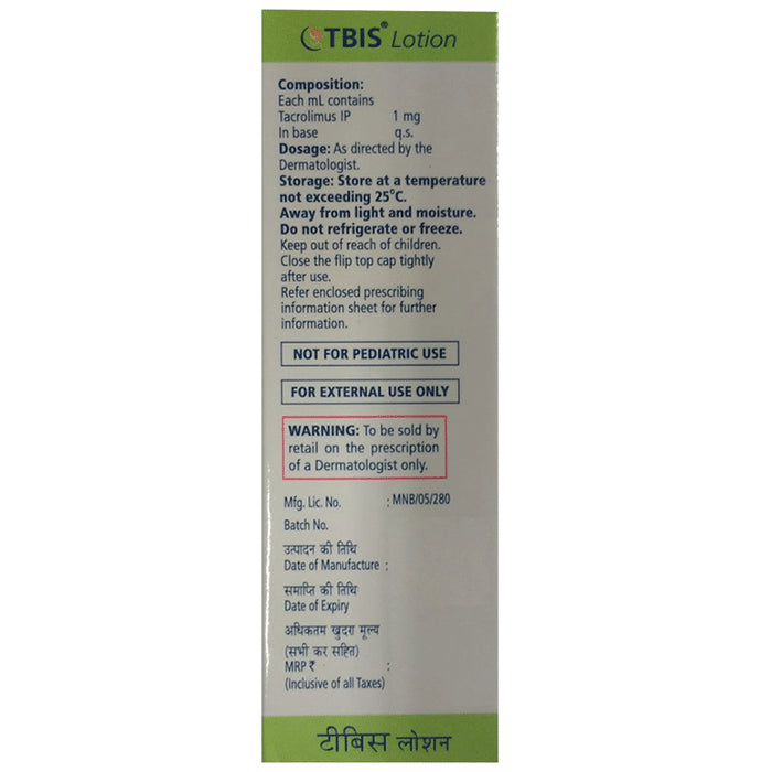 Tbis Lotion is used to treat eczema (atopic dermatitis). It works by suppressing the activity of certain immune cells that cause inflammation (redness and swelling) of the skin. This relieves itching and improves rashes in atopic dermatitis. Tbis Lotion is used for external use. It should be used 2-4 times a day on the affected area or use it as suggested by the doctor. It should be applied slowly and evenly to the skin until it is rubbed in. You should not use it too often and you should not cover the treated area with a bandage or plaster. You must inform your doctor if there’s no improvement even after two weeks of treatment or if the skin gets worse.Use of this medicine may cause some common side effects like erythema, headache, inflammation of hair follicle, and application site reaction like burning, irritation, itching, and redness. This medicine is not normally recommended during pregnancy or while breastfeeding unless it is clearly needed.