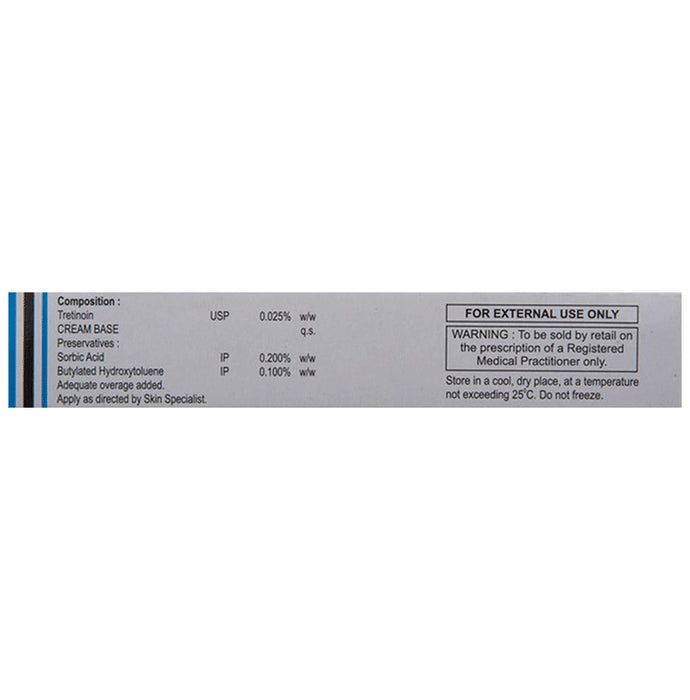 Tretin 0.025% Cream is a form of vitamin A. When applied on the skin, it reduces oil production in the skin, replenishes acne-prone skin, and helps keep your pores open.