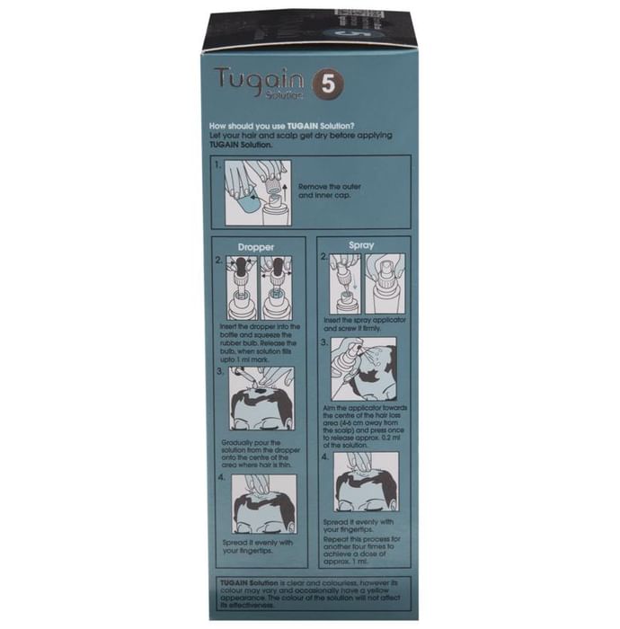Tugain 5% Solution is a potassium channel opener. Its vasodilation action expands the blood vessels. Therefore, when it is applied to the scalp, it helps to increase blood flow. This increased blood flow provides more nutrition and oxygen to the hair follicles, which prevents hair cell death and also enhances new hair growth. This is how it works to treat your alopecia (hair loss).